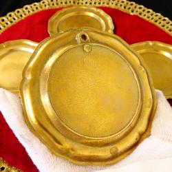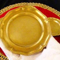 Стари чинии за хапки, гурме, подложни чинии за чаши, изработени от масивен бронз. Периферията е релефно декорирана. Чиниите имат стабилни окачалки за стена. Диаметър 10.5 см., височина 1 см., тегло на всяка 90 гр. Комплект от 4 броя, цена 12 лв. /6.14€