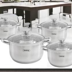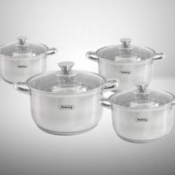 Комплект тенджери от висококачествена наръждаема стомана. Специално, многослойно, термо дъно за оптимална топлопроводимост. Нитовани дръжки от неръждаема стомана за допълнителна стабилност. Капак от закалено стъкло с отвор за пара. Мерителна скала за обем. Подходящи за всякакъв вид котлони: газови, индукционни, халогенни, електрически. Спестява енергия. Подходящи за съдомиялна машина. Комплекта съдържа: Тенджера: 16x10 см - 1.8 л. Тенджера: 18x11 см - 2.5 л. Тенджера: 20x12 см - 3.4 л. Тенджера: 24x14 см - 5.8 л. |