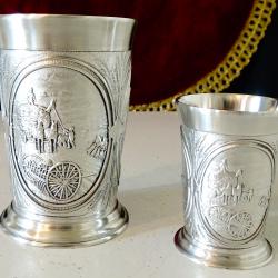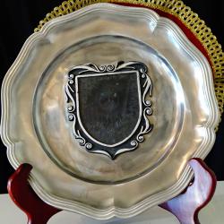 Стара немска калаена чиния за стена, пано, релефна картина, майсторска ръчна изработка от 95% калай и 5% сребро, маркирана от производителя. В центъра има прецизно изваяна релефна картина Сватосване. Щастливото събитие е пресъздадено като на живо, истински шедьовър на изкуството. Периферията на чинията е декорирана с дъбови клонки с жълъди и нежен релеф. Има стабилна окачалка за стена. Диаметър 23 см., височина 2 см., тегло 390 гр. Високо качество, масивност и сребърен блясък, идеален подарък за калаена сватба, семейство.