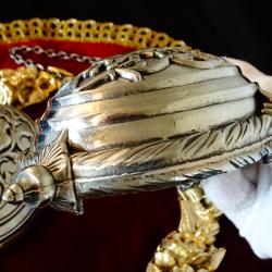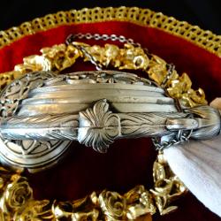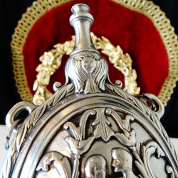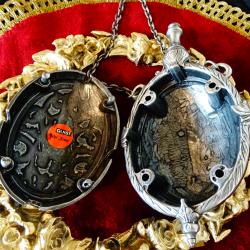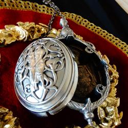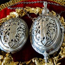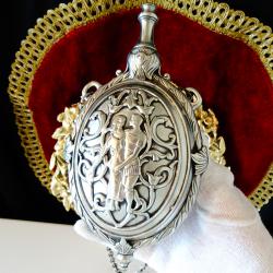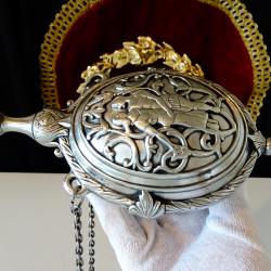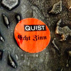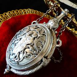 Стара немска калаена барутница, майсторска ръчна изработка от 95% калай и 5% сребро със запазен етикет на световно известната западно германска фабрика Quist. Декорирана с прецизно изваяни релефни фигури на Адам и Ева, сред приказно красиви релефни флорални орнаменти, като в Райската градина. Ефектно издържана в стил Art Nouveau, барутницата символизира двете половини на семейството, които плътно сплотени съхраняват барута, пламъка и топлината в дома. Има здрав синджир за окачване. Истинско произведение на изкуството, предназначена за калаена сватба, семейство, дом. Размер 18 х 11 х 8 см. Височина със синджира 37 см. Тегло 540 гр.
