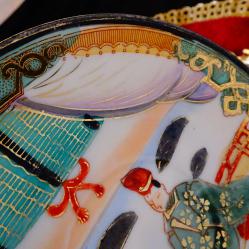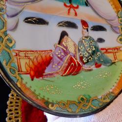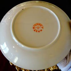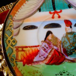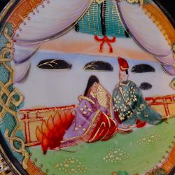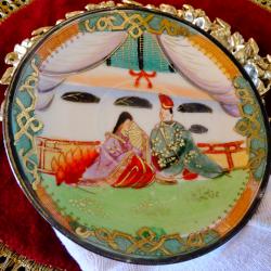 Стара китайска порцеланова чиния, китайски костен порцелан, ръчно рисувана с гейша и император в дворец и много злато 24 карата. Маркирана, датира от 1940 година. Диаметър 14 см., височина 2 см.