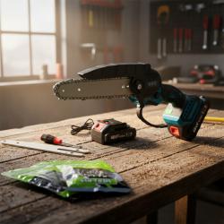 Материал / корпус: Устойчив пластмасов корпус с метални елементи; Тип: Безжична акумулаторна верижна резачка; Дължина на веригата: 6” (15 см); Мотор: Деклариран 1500W; Скорост на веригата: до 5 м/с; Батерия: 2 × 48VF литиево-йонни батерии, 4000mAh (включени в комплекта, не се изисква допълнителна покупка); Зареждане: Зарядно за стена (включено); Комплектът съдържа: резачка UKC, 2 батерии, 2 вериги, водач за верига, зарядно, отвертка, ръководство; Приложение: резитба на клони, рязане на дърва за огрев, градинска поддръжка. |