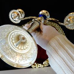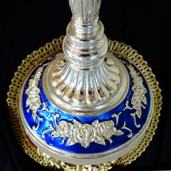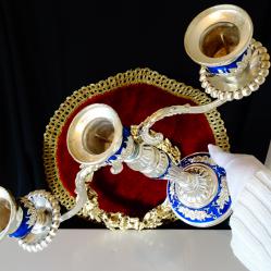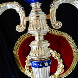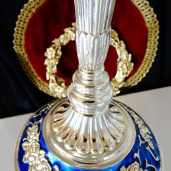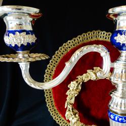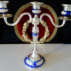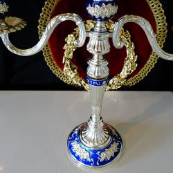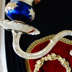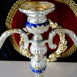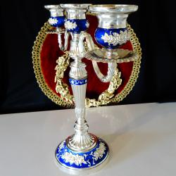 Стар троен свещник, свещник с три гнезда, свещник тройка, майсторска ръчна изработка от високо качествена мед, дебело посребрен с висока проба сребро, родиран за блясък и трайност. Ефектно издържан в стил рококо, свещника блести с приказна красота – чудни релефни орнаменти, прецизно изваяни релефни рози, подчелтани от мастилено син кобалтов емайл. Впечатляващ свещник, създаден от истински творец за да радва душата и сетивата на всеки домакин. Височина 31 см., дължина 32 см., диаметър на основата 12 см. Тегло 910 гр.