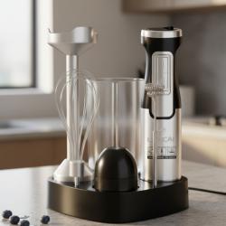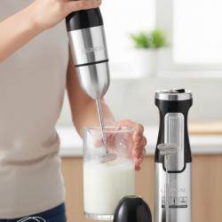 Материал / корпус: Неръждаема стомана; Мощност: 800W; Скорости: 5 скорости + турбо функция; Ножове: 4 титаниеви ножа; Смесителен вал: Сваляем за лесно почистване; Индикатор: LED светлина; Включени аксесоари: Бъркалка за яйца, разпенител за мляко, мерителна чаша (600 мл); Размери / тегло: Компактен и лесен за съхранение. |