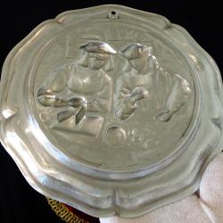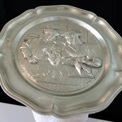Стара немска калаена чиния за стена, пано, майсторска ръчна изработка от 95% калай и 5% сребро, маркирана с печат на производителя. В центъра има прецизно изваяна релефна репродукция на картината ”The money changer and his wife” на фламандския художник Quentin Matsys, която той рисува през 1514 година. В момента се съхранява в Лувъра в Абу Даби. Докато съпругът претегля златото и скъпоценностите, съпругата е седнала до него и чете книга с илюстрация на Богородица с Младенеца. Паното е подходящо за подарък на семейство, калаена сватба, като символ на единство и просперитет. Има стабилна окачалка за стена. Диаметър 23 см., височина 2 см. Тегло 320 гр.