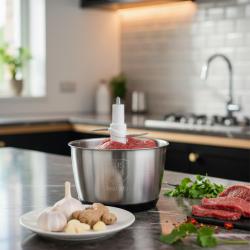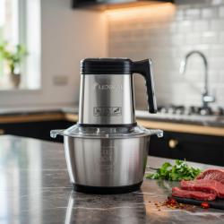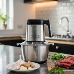 Вид уред: Електрически чопър; Мощност: 300 W; Напрежение: 220–240 V ~ 50/60 Hz; Обем / вместимост: 2 литра; Режими: 3 нива на скорост; Ножове: 6 титаниеви остриета, разглобяем монтаж; Материали / корпус: Неръждаема стомана; Купа: Неръждаема стомана; Цвят: Инокс; Ниво на шум: Нормално за класa; Енергийна ефективност / защити: Стабилна конструкция за безопасна работа; Батерия: Не използва батерии – работи с електрическа мрежа. |