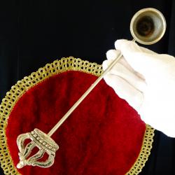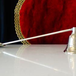 Стар английски гасител за свещи, майсторска ръчна изработка от бронз, дебело посребрен с висока проба сребро, родиран за блясък и трайност. Декориран с релефна кралска корона. Дължина 28 см., диаметър на чашката 4.5 см., тегло 50 гр. Перфектен.