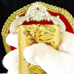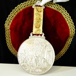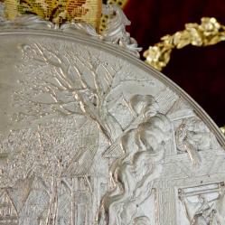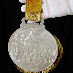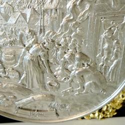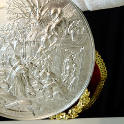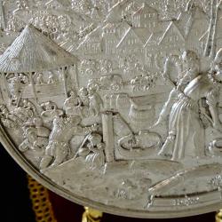 Старо калаено пано за стена с дизайн на медал, плакет, майсторска ръчна изработка от 95% калай и 5% сребро, маркирано с печат на световно известната немска фабрика WMF. Декорирано с прецизно изваяна релефна картина, която многопланово и живописно представя многобройните задачи на село през есента – гроздобер, мачкане на гроздето, производство на вино, жътва, а на горкото прасенце никак не му върви…И над цялата суматоха – от едно малко прозорче се виждат двама влюбени, които напук на всичко са се посветили един на друг. Паното има сърмена окачалка за стена, декорирана с рози. Перфектно качество със сребърен блясък, идеален подарък за калаена сватба. Височина 33 см., диаметър 16 см., тегло 218 гр.