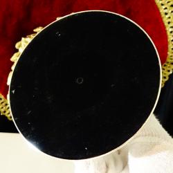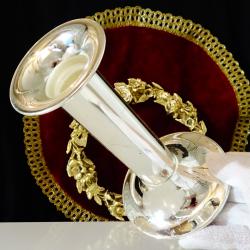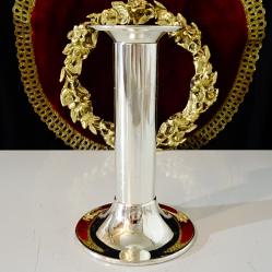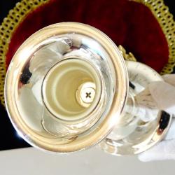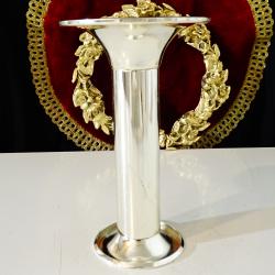 Стар масивен бронзов свещник, дебело посребрен с висока проба сребро, родиран за блясък и трайност. Основата има меко кадифе. Стилен класически дизайн с огледален блясък. Височина 16 см., диаметър на основата 10 см., тегло 330 гр.