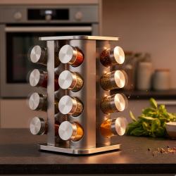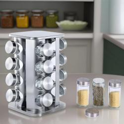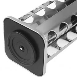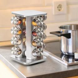 Материал: неръждаема стомана (стойка), прозрачни бурканчета; Размери на стойката: височина 28 см, ширина 16,5 см; Размери на бурканче: височина 10 см, диаметър 4,2 см; Капацитет: 16 бурканчета за подправки; Механизъм: въртяща се основа за лесен достъп; Поддръжка / почистване: лесно почистване, подходящо за ежедневна употреба; Безопасност: подходящо за съхранение на хранителни продукти. |