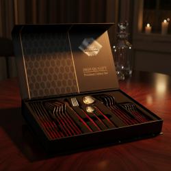 Технически характеристики: Материал: Неръждаема стомана; Брой части: 24 (за 6 души); Съдържание: 6 х н о ж о в – 22 см х 1,5 см; 6 х вилици – 22,5 см х 2,7 см; 6 х супени лъжици – 22 см х 5 см; 6 х десертни лъжички – 13 см х 3 см; Цветови варианти: Сребристо; златисто с черно; златисто с розово; златисто с червено; Поддръжка / почистване: Лесно измиване, устойчиви на честа употреба; Безопасност: Подходящи за контакт с храна; Опаковка: Магнитна кутия. |