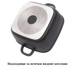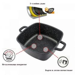 Материал: Лят алуминий, мраморно покритие, закалено стъкло, неръждаема стомана; Размери: Тенджера ø20 см; Тенджера ø24 см; Тенджера ø28 см; Покритие: 3-слойно мраморно, незалепващо, антибактериално; Съвместимост: Газови, електрически, керамични и индукционни котлони; Поддръжка / почистване: Подходящи за съдомиялна машина; Допълнителни функции: Отлично разпределение на топлината. |
