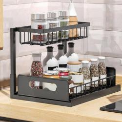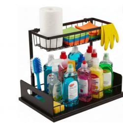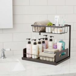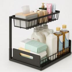 Размери: 36 x 27 x 28,5 см; Материал: Здрава метална рамка; Дизайн: Модерен, минималистичен в черно; Нива: Две за оптимална организация; Страничен държач: За четки и малки аксесоари; |