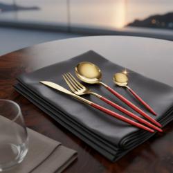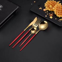 Материал: Неръждаема стомана; Брой части: 24 (за 6 души); Съдържание: 6 х ножове – 22 см х 1,5 см; 6 х вилици – 22,5 см х 2,7 см; 6 х супени лъжици – 22 см х 5 см; 6 х десертни лъжички – 13 см х 3 см; Цвят: златисто с червено; Поддръжка / почистване: Лесно измиване, устойчиви на честа употреба; Безопасност: Подходящи за контакт с храна; Опаковка: Магнитна кутия. |
