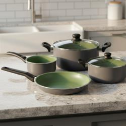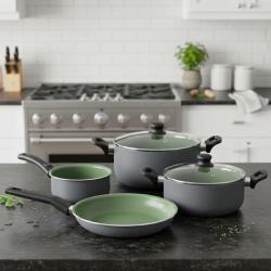 Материал: Алуминий; Размери: Касерола: 16 см; Тенджера: 20 см; Тенджера: 24 см; Тиган: 24 см; Покритие: Незалепващо Pfluon; Цвят: Сиво и зелено; Поддръжка: Лесно почистване, съвместим със съдомиялна машина; Капак: Стъклен с отвор за пара; Съвместимост: Подходящи за всички видове котлони, включително индукционни. |