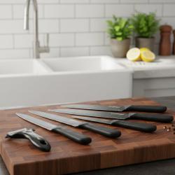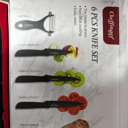 Комплектът включва: Готварски н о ж – 20 см; Н о ж за хляб – 16 см; Универсален н о ж – 13 см; Н о ж за обезкостяване – 12 см; Н о ж за белене – 9,5 см; Белачка; Поддръжка / почистване: лесно ръчно измиване; Допълнителни функции: магнитна подаръчна кутия; Безопасност: подходящи за домашна употреба и контакт с храна. |