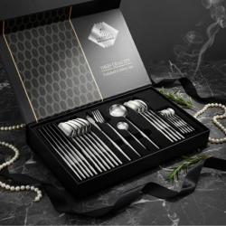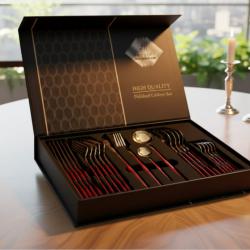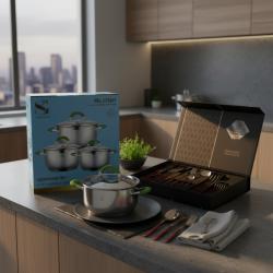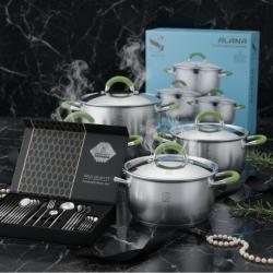 Комплект тенджери: Материал: Неръждаема стомана; Размери: Малка тенджера: 16x9.5 см; Средна тенджера: 18x10.5 см; Голяма тенджера: 20x11.5 см; Дъно: 5-слойно капсулно, осигуряващо равномерно нагряване; Капак: Стъклен с отвор; Цвят: Инокс - Зелени дръжки; Допълнителни функции: Турбо индукция за по-бързо готвене. Прибори: Материал: Неръждаема стомана; Брой части: 24 (за 6 души); Съдържание: 6 х ножове – 22 см х 1,5 см; 6 х вилици – 22,5 см х 2,7 см; 6 х супени лъжици – 22 см х 5 см; 6 х десертни лъжички – 13 см х 3 см; Цвят: златисто с червено, златисто с черно, златисто с розово, сребрист, златист; Поддръжка / почистване: Лесно измиване, устойчиви на честа употреба; Безопасност: Подходящи за контакт с храна; Опаковка: Магнитна кутия. |