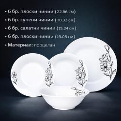 Технически характеристики: 6 бр. плоски чинии (22.86 см); 6 бр. супени чинии (20.32 см); 6 бр. салатни чинии (15.24 см); 6 бр. плоски чинии (19.05 см); Материал: порцелан; Подходящ за съдомиялна машина; |