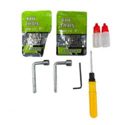 Акумулаторен тример: скорост 12 000 об/мин, ширина на косене 23 см, телескопична дръжка 93–125 см, косяща глава с циркулярен диск и възможност за 2 метални или 5 пластмасови остриета, време на работа до 40 мин. Акумулаторна ножица: максимален диаметър на рязане 33 мм, 36V, 8Ah, време на работа до 50 мин. Акумулаторен трион: 36V, 8Ah, дължина на веригата и шината 15 см, обороти до 10 000 об. /мин, време на работа до 50 мин. Зарядно устройство 36V; 3 батерии 36V/8Ah; 2 резервни вериги; 1 шина 15 см; циркулярен диск 23 см. |