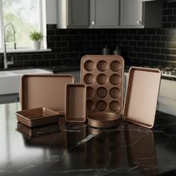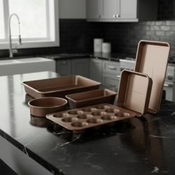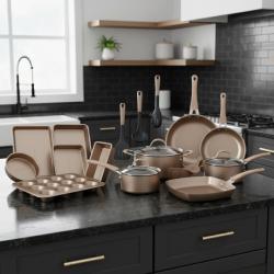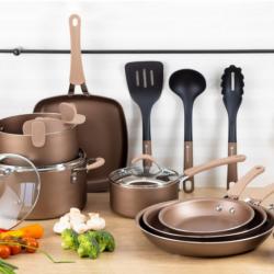 Материал: кован алуминий Покритие: мраморно, незалепващо, без PFOA Дръжки: силиконови, меки на допир, устойчиви на нагряване Капаци: закалено стъкло с отвор за пара Съвместимост: всички видове котлони, включително индукция Размери и съдове в комплекта: Тенджера 16 x 8 см с капак — 1,6 л Тенджера 20 x 9 см с капак — 2,8 л Тенджера 24 x 12 см с капак — 5,4 л Тиган 20 x 4 см Тиган 26 x 4,8 см Тиган 30 x 5 см Квадратен тиган 24 x 24 x 4,3 см 3 бр. найлонови кухненски инструменти 6 бр. тави: Тава за мъфини 15,35 x 11,02 x 1,57 см Форма за кекс 9,09 x 5,04 x 2,72 см Кръгла тава 8,54 x 1,97 см Тава 13,38 x 9,64 x 2,16 см Тава 13,38 x 9,64 x 1,38 см Цедка |