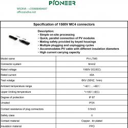 MC4 от най-висок клас материал PPO. MC4 - 1500V, е с твърди пинове, 45A Номинален ток 45A Номинално напрежение 1500V DC Тип Комплект - ip 67 |