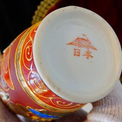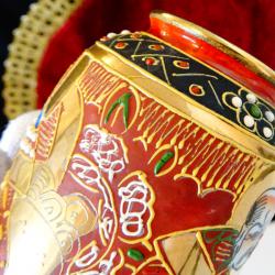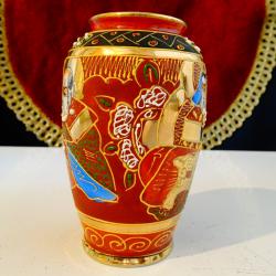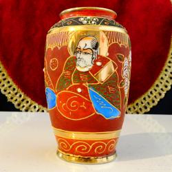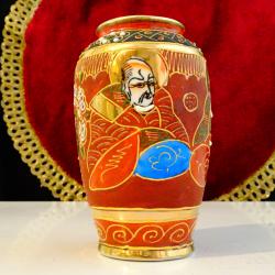 Японска порцеланова ваза, японски костен порцелан, ръчно рисувана в стил Satsuma с изпъкнали цветни емайли Moriage и блестящо злато 24 карата. Изобразена е японската богиня на милосърдието Канон Босацу. От двете й страни стоят учениците на Буда, наречени Rakan. Високо качество с прецизен рисунък, маркирана с печат на производителя. Датира от 1930 г. Височина 10 см., диаметър 6 см., тегло едва 82 гр.