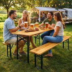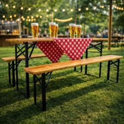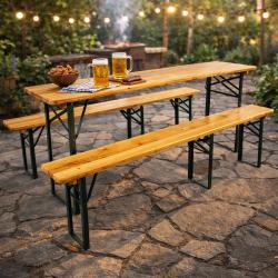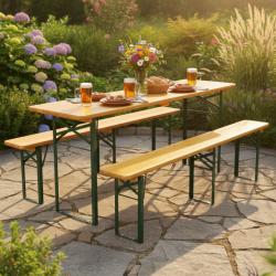 Идеален избор за посрещане на неочаквани гости, градинско парти, барбекю или други събития. Комплекта е сгъваем, лек, компактен и удобен за употреба или съхранение. Размери маса: 176 x 46 x 76,5 cm Размери пейка: 176 x 23 x 46,5 cm Дебелина на пейка: 3 cm Тръби (крака): 27 x 27 x 2,3 mm Цвят: Натурален Материал: чамово дърво, устойчиво на атмосферни влияния и стоманени сгъваеми крака Употреба: подходящ за градини, тераси, дворове, барбекюта, къмпинг, заведения Изпраща се по Еконт. |