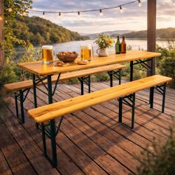 Сгъваем комплект градинска маса с 2 пейки - от чамово дърво, с отвор з