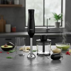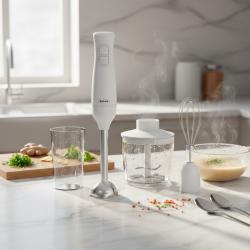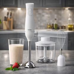 Мощност: 350 W Напрежение: 220-240V~, 50/60Hz Степени на скорост: 2 Капацитет на мерителната чаша: 700 ml Капацитет на купата за рязане: 0.7 l Материал на накрайника и ножа: неръждаема стомана Функции: пасиране, разбиване, рязане |