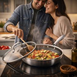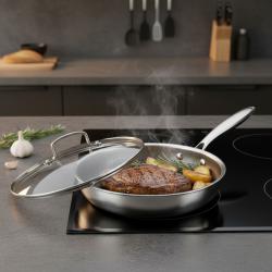 Размер: 24 x 5 см - 33€ 26 х 5 см - 35€ Материал на тигана: Неръждаема стомана (вътре и отвън) Материал на дръжката: Неръждаема стомана Трислойно дъно за равномерно разпределяне на топлината Незалепващо покритие без PFOA Устойчивост във фурна: до 220 °C Съвместимост: индукционни, стъклокерамични, газови и електрически котлони Не е подходящ за микровълнова печка |