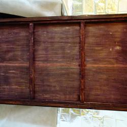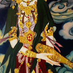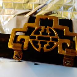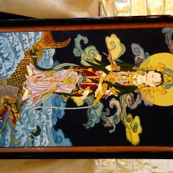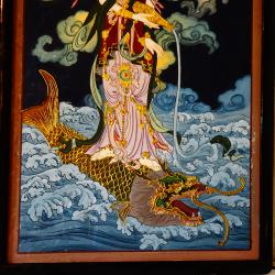 Стара японска картина с рамка, ръчно рисувана върху естествено дърво със сложната техника Гваш /gouache/. Трайните цветове идват от лапис лазули, цинобър и малахит. Изобразена е богиня Guanyin / Quan Yin, Kwan Yin/, стъпила върху риба-дракон. Богиня на милосърдието и състраданието, спасителка на душите и покровителка на моряците. Тя излива нектара на живота или жива вода от златна ваза, която лекува болести, пречиства и премахва страданията. Има божествен ореол – сирашчакра, който осветява красивото й лице и пътя над океанските вълни. Ефирните одежди са обсипани с релефни бижута. Сияйният блясък на сцената се допълва от 24 каратово злато, което засилва божественото присъствие. Картината е приказен шедьовър на будисткото изкуство, духовна декорация за дома. Тя е свещен разказ за трансцендентната красота, хармонията и благословиите. Размер 96 х 54 х 3 см. Височина 101 см. Има масивна бронзова окачалка за стена със символ за двойно щастие. |