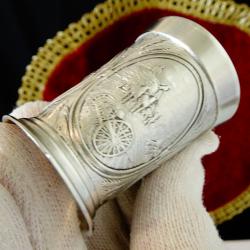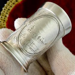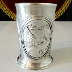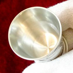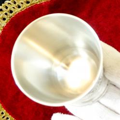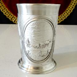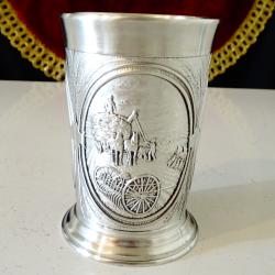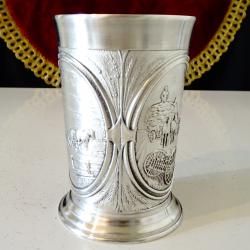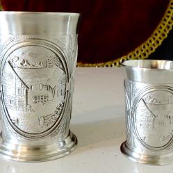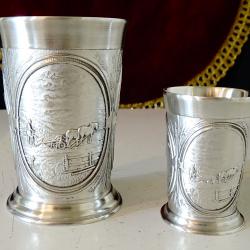 Калаена чаша за вино и калаена чаша за ракия, майсторска ръчна изработка от 94% калай и 6% сребро, маркирани с печат на производителя. Чашите са декорирани с прецизно изваяни релефни картини, живописни сцени от живота на село – Оран, Сенокос, Почивка във фермата. Всяка картина има ефектна рамка с житни класове. Високо качество със сребърен блясък от вън и от вътре. - чаша за вино – височина 7.5 см., диаметър 5 см., тегло 110 гр. Вместимост 120 мл. Цена 23 €. - чаша за ракия, ликьор – височина 5 см., диаметър 4 см., тегло 40 гр. Вместимост 50 мл. Цена 10 €. |