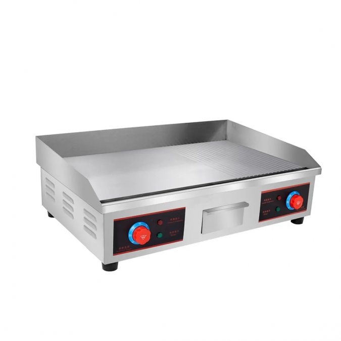 Скара със гладко-оребрена плоча 73 см е професионален уред за ресторанти, кухни и заведения за бързо хранене, където се изисква бързо и равномерно приготвяне на месо, зеленчуци и други топли ястия. Здравият корпус от неръждаема стомана осигурява устойчивост на високи температури, корозия и интензивна ежедневна употреба. Скарата разполага с две независими зони за готвене, които позволяват едновременно приготвяне на различни продукти. Температурата на всяка зона се регулира до 300°C, което дава пълен контрол върху процеса на печене. Гладко-оребрената плоча комбинира равномерно изпичане и характерна грил текстура, а тавичката за събиране на мазнина улеснява почистването и поддържа работната зона чиста. Технически характеристики Размери: 73 × 47 × 24 см Тегло: 32 кг Температурен диапазон: до 300°C Мощност: 4.4 kW Захранване: 220–240 V / 50–60 Hz |