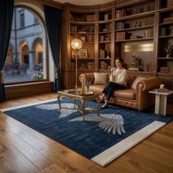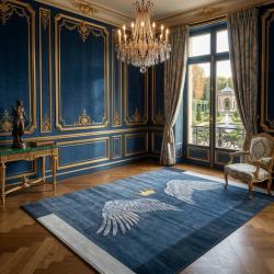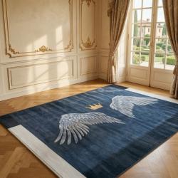 Модерен килим за хол 120х160см - Тъмносин с крила и корона и 3D ефект,
