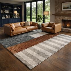 Технически характеристики на Модерен килим за хол 120х160см - Кафяв меланж с бежови райета и 3D ефект, Противоплъзгащ Техническите параметри гарантират издръжливост и комфорт при употреба: Размер: 120 х 160 см — оптимален за холни зони и пред мебели. Материал горна повърхност: мек синтетичен ворс с 3D печат за наситени нюанси и устойчивост на износване. Основен слой: противоплъзгаща PVC/латекс подложка за сигурна фиксация на пода. Поддръжка: прахосмукачка за ежедневна грижа; влажно избърсване при петна; професионално почистване при нужда. Съвместимост: подходящ за повечето видове подово отопление при умерени температури. |