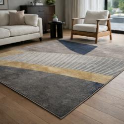 Технически характеристики на Модерен килим за хол 120х160см - Сиво с диагонална златна лента и 3D ефект, Противоплъзгащ Техническите параметри гарантират дълготрайност и удобство при употреба: Размер: 120 х 160 см — стандартен за холни зони и предни пространства Материал на повърхността: висококачествени синтетични влакна с 3D печат за наситени цветове Подложка: противоплъзгаща PVC/латекс основа за стабилно прилепване към пода Поддръжка: прахосмукачка за ежедневна грижа, влажно почистване за петна, професионално почистване при необходимост Съвместимост: подходящ за повечето подови настилки и системи за подово отопление при нормални работни температури |