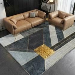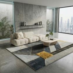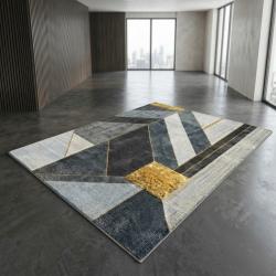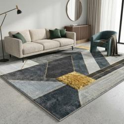 Модерен килим за хол 120х160см - Геометрично сиво със жълт квадрат и 3