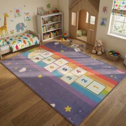 Детски килим за игра 120х160см - Тъмносин килим с облачета и дъга, про