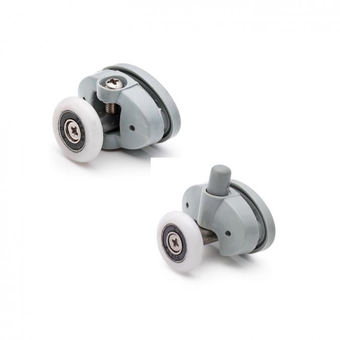 Ролки за врати на душ кабина с метален лагер. Диаметър на колелцата- 23 мм. Разстояние между центъра на двата отвора: 26 мм Долни с бутон, единични - 4 броя Горни- единични - 4 броя В комплекта са включени и стопери |