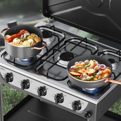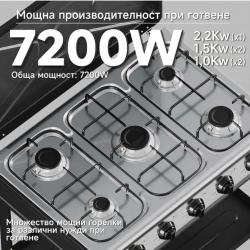 Обща мощност: 7,2 kW Бързи горелки: 2 x 2,2 kW Централна горелка: 1 x 1,5 kW Спомагателни горелки: 2 x 1,0 kW Брой горелки: 5 Материал: плот от неръждаема стомана, емайлирани капачки, алуминиеви горелки Налягане: 50 mbar Газов маркуч: 1,5 м Запалване: автоматично Рафтове: 2 странични/стелажни нива за съхранение |