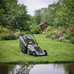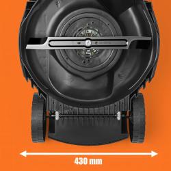 Мощност: 2400 W Захранване: 220V / 50Hz Скорост на въртене: 3500 об. /мин Ширина на рязане: 43 см Капацитет на коша: 50 л Височина на рязане: 30–75 мм (5 степени) Размери: 130 × 35 × 105 см Тегло: приблизително 15 кг Колела с грайфер за стабилност на неравни терени Дръжка с меко покритие и сгъваема конструкция за съхранение |