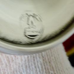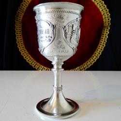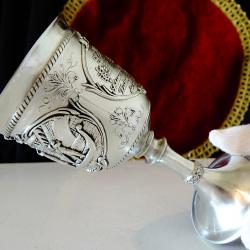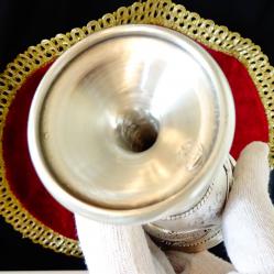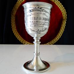 Стар немски калаен бокал за вино, чаша на столче, майсторска ръчна изработка от 95% калай и 5% сребро, маркиран с инициалите на световно известната фабрика SkS. Декориран с прецизно изваяна релефна картина на двойка влюбени, младоженци в красива венецианска гондола, управлявана от гондолиер, която се носи сред живописните сгради и мостове на Венеция. От обратната страна на чашата е изписан съвсем точно нотният текст на прочутата баркарола „Красива нощ, о, нощ на любовта” „ „Нощ по-сладка от деня, о, прекрасна нощ на любовта Времето лети и отнася нашата нежност завинаги” от операта Хофманови разкази на френския композитор Жак Офенбах и неговият подпис. Разкошни орнаменти допълват това истинско произведение на изкуството, създадено като незабравим подарък за калаена сватба или младоженци. Височина 12 см., диаметър 6 см., тегло 140 гр. Вместимост 130 мл. |