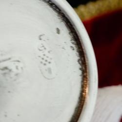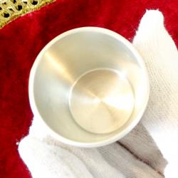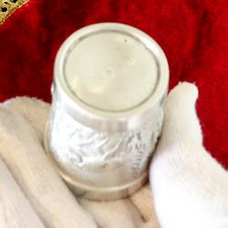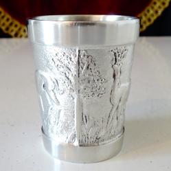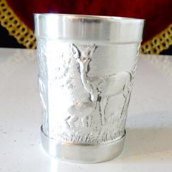 Стара немска калаена чаша, майсторска ръчна изработка от 95% калай и 5% сребро, маркирана с печат на производителя. Декорирана с релефно изображение на Елен и Сърна с малко, сред гората, ловна картина. Височина 5 см., диаметър 4 см., тегло 50 гр. Вместимост 50 мл.