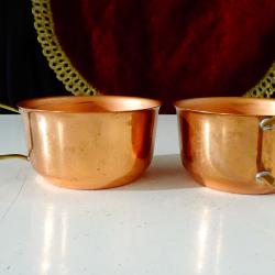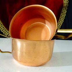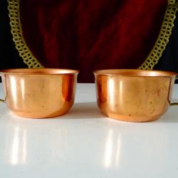 Стари медни чаши за кафе, ракия, медна вода, ръчно изработени от високо качествена чиста мед. Имат стабилни дръжки от позлатен бронз. Височина 5 см., диаметър 7 см., тегло на всяка 50 гр. Вместимост 130 мл. Налични 2 броя, цена 4.60 €., за брой.
