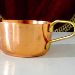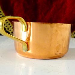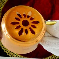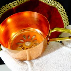 Стара цедка за чай, ръчно изработена от масивна чиста червена мед. Има стабилна дръжка от бронз с дебела позлата. Височина 5 см., диаметър 7 см., тегло 60 гр.