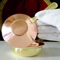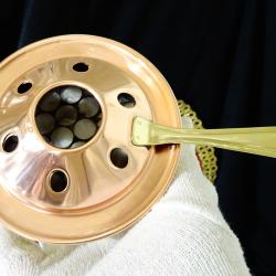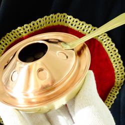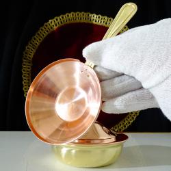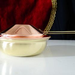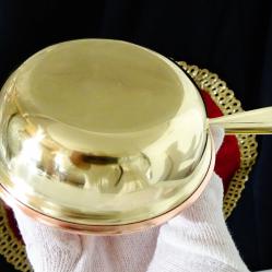Стар немски спиртник, котлон, майсторска ръчна изработка от чиста червена мед. Основата е изработена от як масивен бронз. Перфектен за къмпинг, готвене, затопляне, топло сервиране, фондю и др. Височина 4.5 см., диаметър 10 см., дължина на дръжките 7 см., тегло 170 гр.