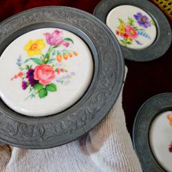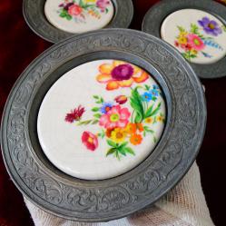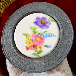 Калаена чиния, пано, подложка за чаша, майсторска ръчна изработка от 95% калай и 5% сребро, маркирана с печат на производителя. В центъра е декорирана с ръчно рисувано изображение на красиви пъстри цветя върху порцелан. Периферията е декорирана с релефно гравирани флорални орнаменти в стил барок. Диаметър 11 см., височина 1 см., тегло на всяка 100 гр. Налични 3 броя, цена 5.50 €., за брой.