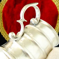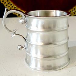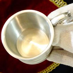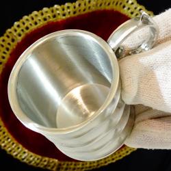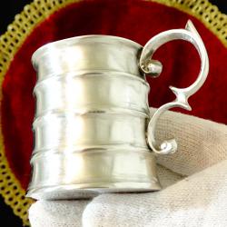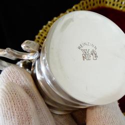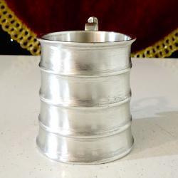 Стара калаена чаша за ракия, ликьор, майсторска ръчна изработка от 95% калай и 5% сребро. Маркирана с инициалите на световно известната Западно Германска фабрика WMF. Високо качествена, масивна със сребърен блясък от вън и от вътре, чашата е декорирана с красив релеф и ефектна дръжка, издържана в стил Art Nouveau. Височина 5.5 см., диаметър 4.5 см., тегло 120 гр. Вместимост 80 мл. |