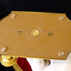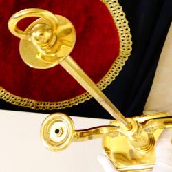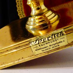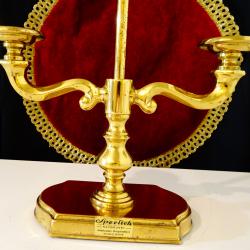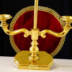 Стар двоен свещник, свещник за две свещи, свещник с две рамена, изработен от свръх масивен бронз с дебела 24 карата позлата. Красиво декориран с релефни орнаменти в стил Art Nouveau. В центъра има висок държач за лесно пренасяне или за окачване. Свещника е със запазен етикет от немското ателие Sperlick за интериор във Висбаден. Изключително подходящ за кръгли свещи и свещи тип яйце. Височина 42 см., дължина 24 см., размер на основата 15 х 9 см. Тегло 1.2 кг.