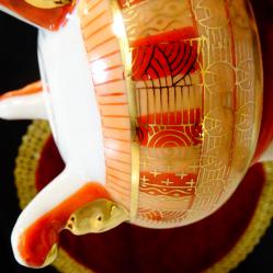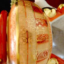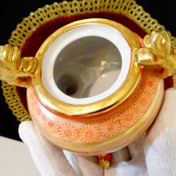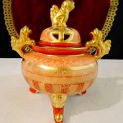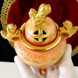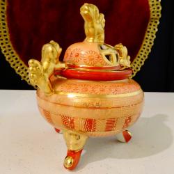 Стара кадилница, кадило, кандило, тамянник, захарница, японски фин порцелан. Ръчно рисувана в стил Ku Tani „Хиляда лица”. С фини контури от 24 карата злато са изписани множество лица и красиви орнаменти. Има три обемни златни фигури на кучета Foo, пазители на храмовете. Капачето на кадилницата е маркирано със златния герб на фамилията Satsuma. Маркирана с печат, датира от 1940 година. Височина 11 см., диаметър 9 см., дължина 12 см.